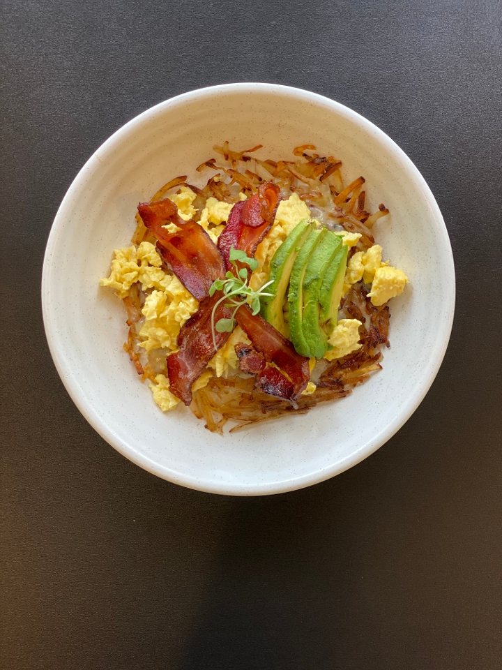 Our most popular breakfast bowl! Two scrambled eggs with avocado, bacon + gruyere cheese served over hash browns. It's nickname is the ABC bowl - avocado bacon cheese bowl!