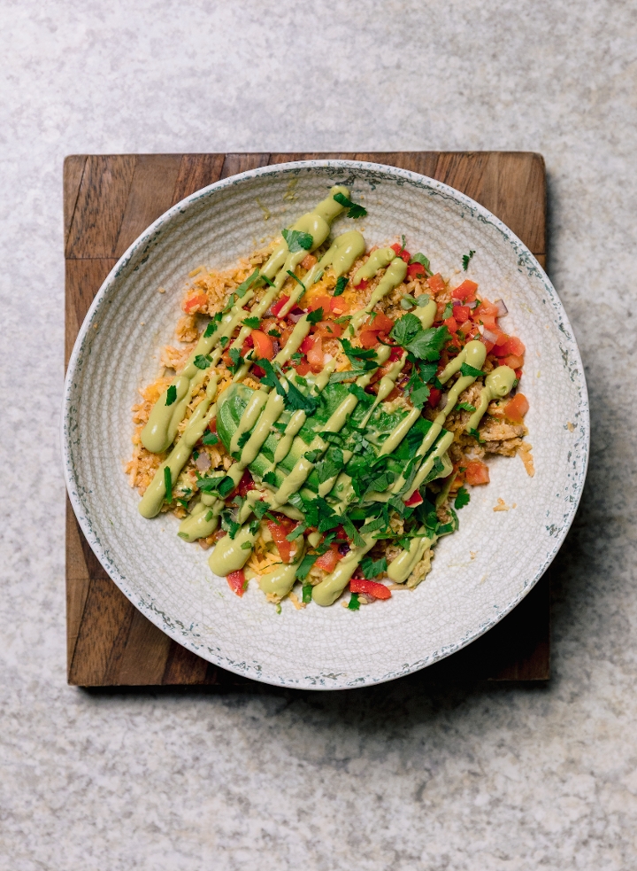 Seasoned Grass-Fed beef over caulirice topped with Chili Campana salsa, cheddar cheese, avocado slices, avocado crema + cilantro