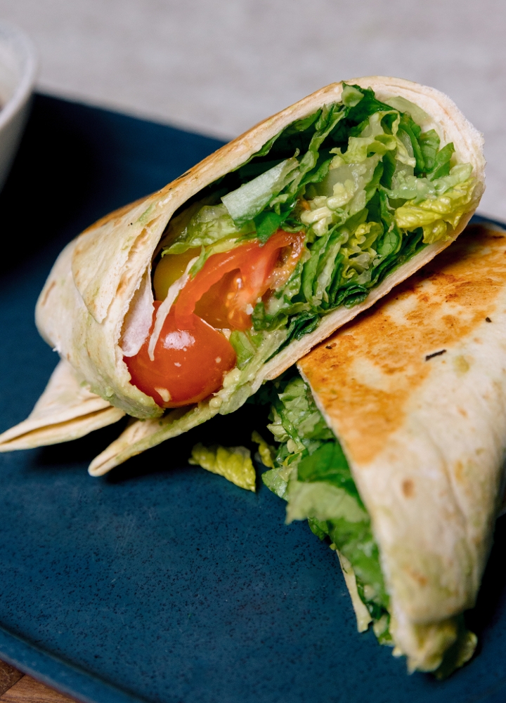 Avocado, tomato + our greens mix tossed in avocado crema wrapped in a flour tortilla